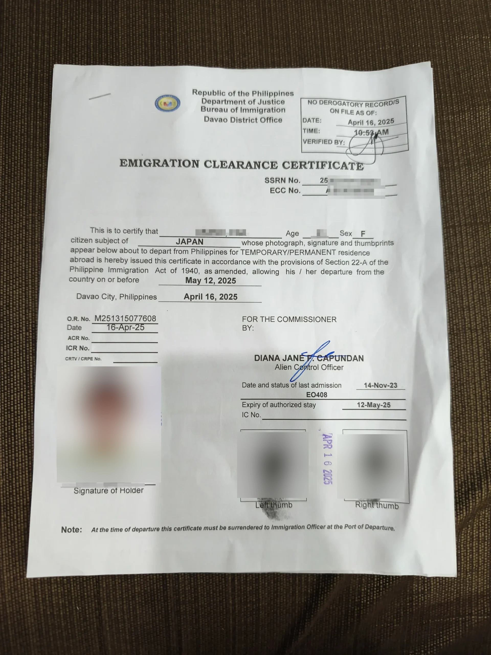 ・Emigration Clearance Certificate